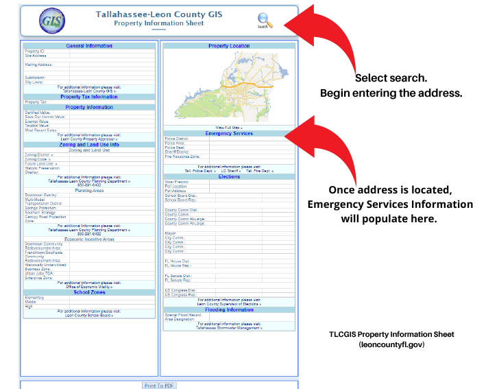 If you are unsure whether the incident location is within the City limits of Tallahassee or outside the city limits, utilize the Tallahassee-Leon County GIS Property Information Sheet found here TLCGIS Property Information Sheet (leoncountyfl.gov) . See below for assistance.